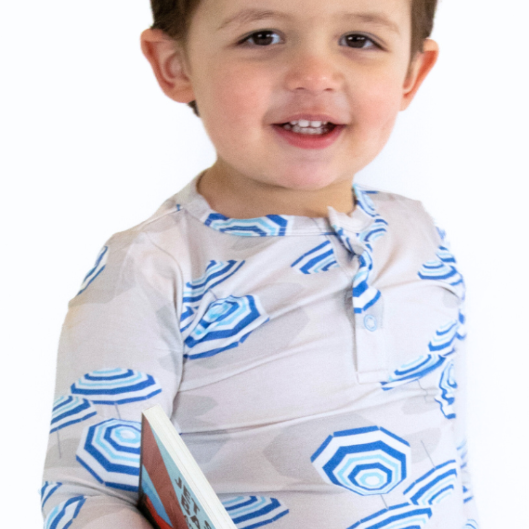 Upgrade your baby's sleepwear with our super soft bamboo zippered romper! Our Beach Club Navy Gray zippered romper is inspired by the iconic beach umbrellas of Capri, Italy with its iconic blue and white beach umbrella print. This color combination is perfect for a baby boy or the Italy/beach lover in your life! Our top selling baby shower and birthday gift, give the gift of a good night's sleep!